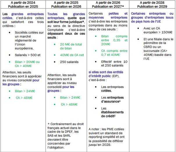 Pour rappel, la CSRD impose que les plus grandes entreprises cotées en bourse1 publient un rapport de durabilité à partir de début 2025 (sur les données 2024), et que les grandes entreprises non cotées2 publient à partir de début 2026 sur les données 2025. Pour ces dernières, il est impératif de démarrer les travaux sur le reporting de durabilité au plus tôt, car le retour d’expérience indique que 12 à 18 mois sont nécessaires pour préparer la première publication.