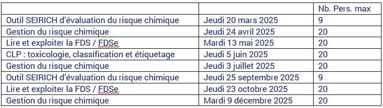France Chimie organise chaque année, pour ses adhérents, des journées gratuites de formation, en lien avec la prévention des risques professionnels. Ces sessions de formation et d’information bénéficient du concours financier de la branche Accidents du Travail et Maladies Professionnelles de la Caisse Nationale de l’Assurance Maladie. De ce fait, elle est réservée aux entreprises cotisant au risque AT/MP.