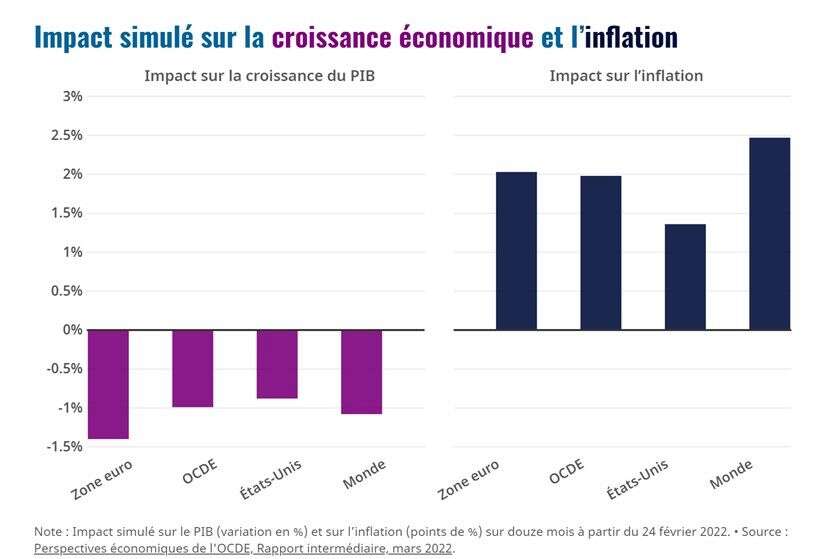 Au-delà de la crise humanitaire provoquée par l’invasion de l’Ukraine par la Russie, des répercussions majeures encore difficiles à mesurer sont en cours sur l’économie mondiale. Elles se propagent notamment par la hausse des prix des matières premières, les échanges mondiaux et la perte de confiance des agents économiques. Selon l'OCDE, l’économie mondiale pourrait perdre 1 point de croissance en 2022 et son inflation augmenter de 2,5 points.