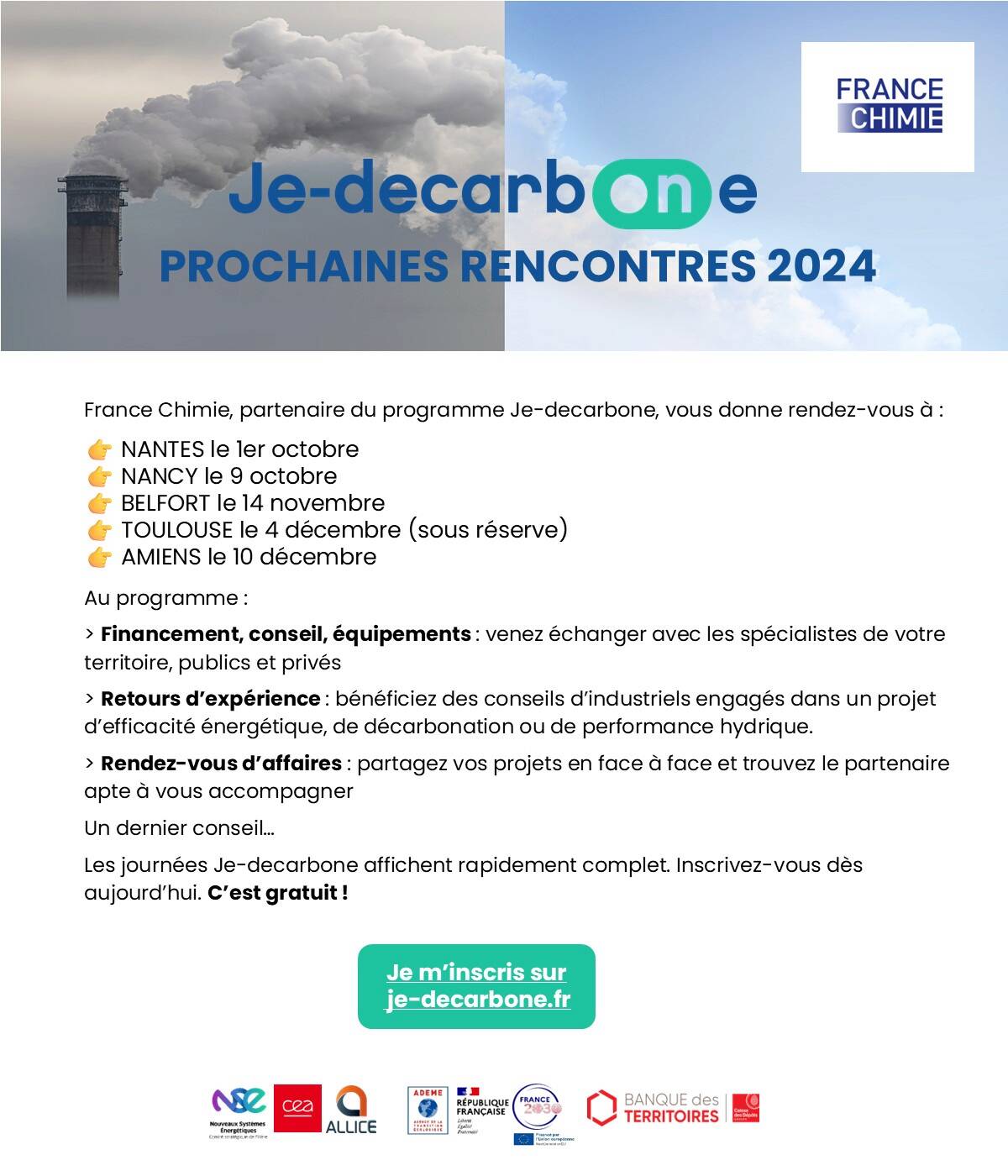 France Chimie, partenaire de Je-décarbone, vous invite à plusieurs événements clés pour accélérer et concrétiser vos projets d'économies d’énergie et de décarbonation !