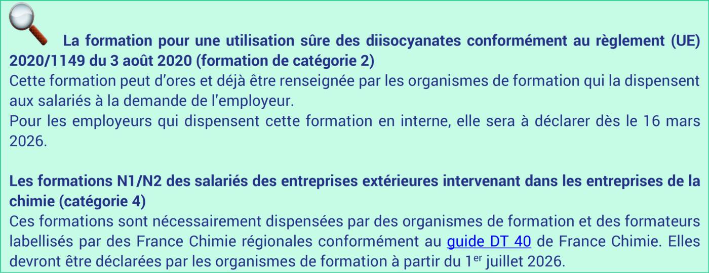 Par exemple, des formations relatives aux opérations sur les installations électriques ou encore la formation pour une utilisation sûre des diisocyanates conformément au règlement (UE) 2020/1149 du 3 août 2020 (voir ici).