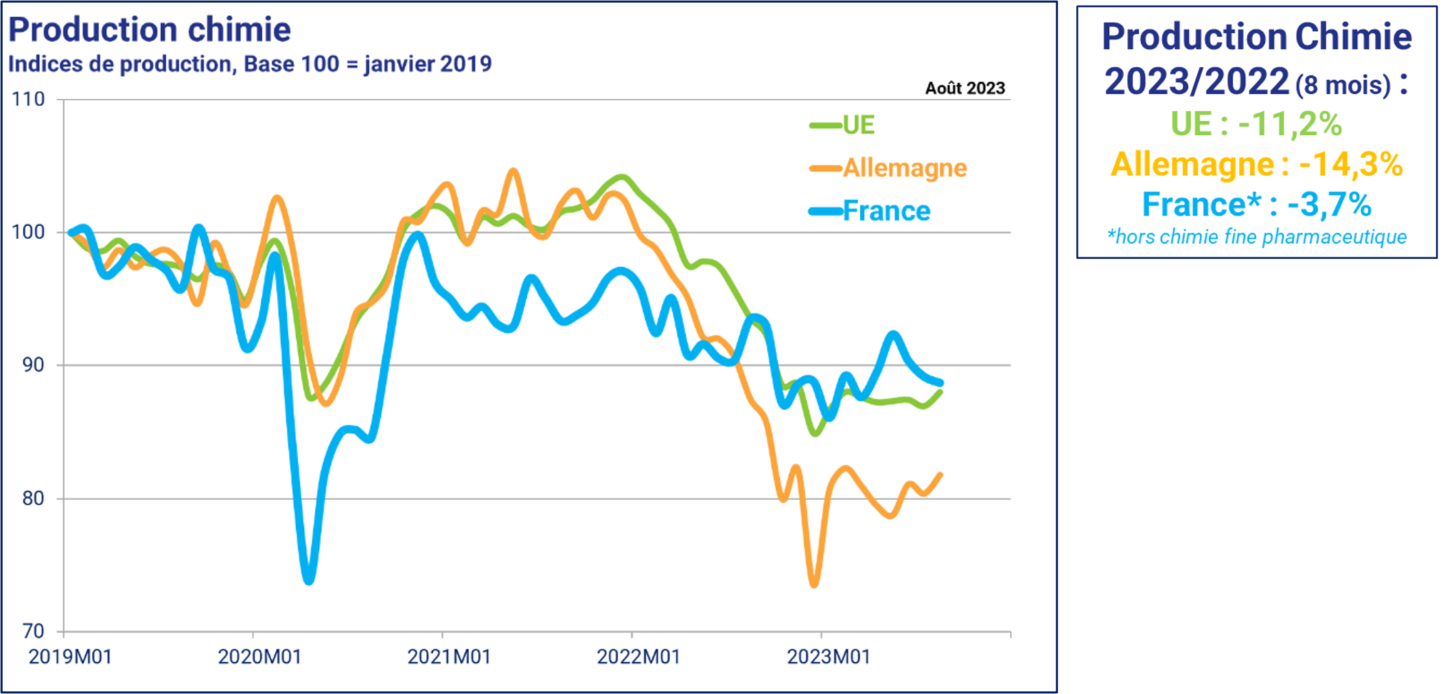Le climat des affaires dans la chimie européenne s’est ainsi encore dégradé laissant peu d’espoir à une reprise de l’activité sur la fin de l’année 2023 et le début 2024, le niveau des stocks de produits finis retrouvant des plus hauts niveaux.