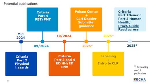 La dernière étape consistera en une validation par les affaires légales et le management de l’agence européenne. Les guides validés seront alors intégrés au guide relatif à l’application des critères du CLP regroupant l’ensemble des classes de danger. Une publication échelonnée selon le calendrier ci-dessous a été présenté par l’ECHA :