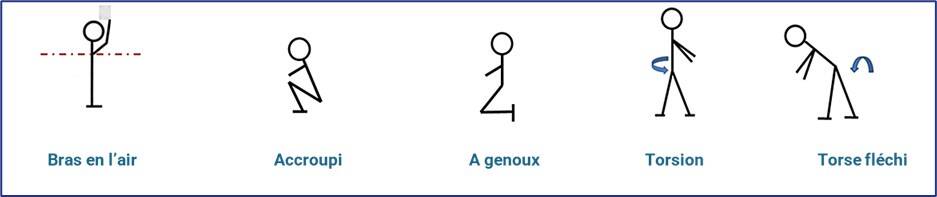 Les postures pénibles sont définies comme des positions forcées : maintien des bras en l’air, positions accroupies ou à genoux, positions du torse...