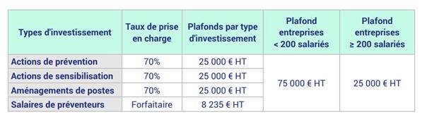 - d’actions de prévention relatives à l’achat d’équipements, à la réalisation de diagnostics ergonomiques et à la formation (salariés, formateurs, dirigeants) ;