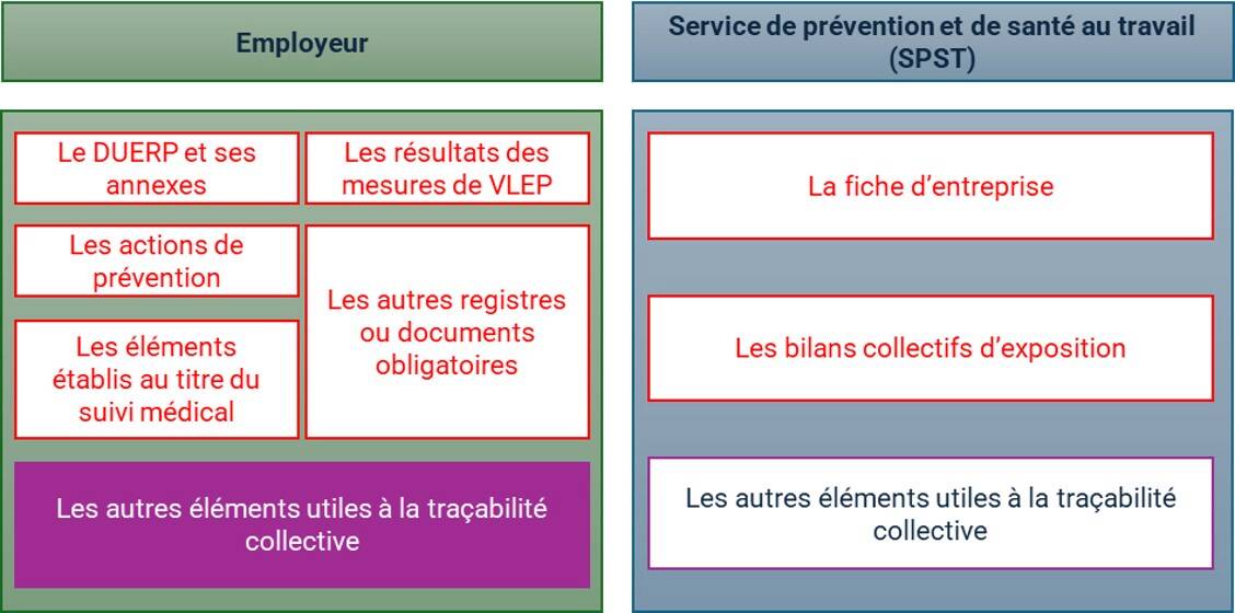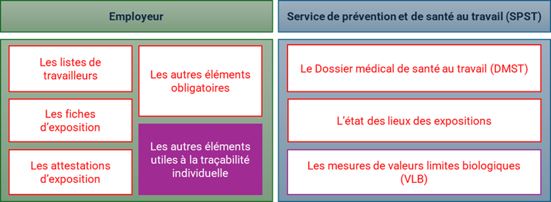 La traçabilité des expositions professionnelles est établie par l’employeur et le Service de Prévention et de Santé au Travail (SPST) au travers d’éléments exigés réglementairement, qui se basent sur des données collectives ou individuelles. Les informations sont utiles notamment pour le suivi médical du travailleur.